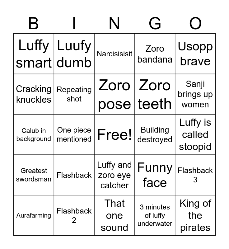 This bingo card has a free space and 24 words: Flashback, Flashback 2, Zoro pose, Aurafarming, Usopp brave, Luffy smart, Cracking knuckles, Luufy dumb, Building destroyed, Luffy and zoro eye catcher, Zoro teeth, Calub in background, Funny face, Flashback 3, Repeating shot, 3 minutes of luffy underwater, Luffy is called stoopid, Narcisisisit, Sanji brings up women, One piece mentioned, King of the pirates, Greatest swordsman, Zoro bandana and That one sound.