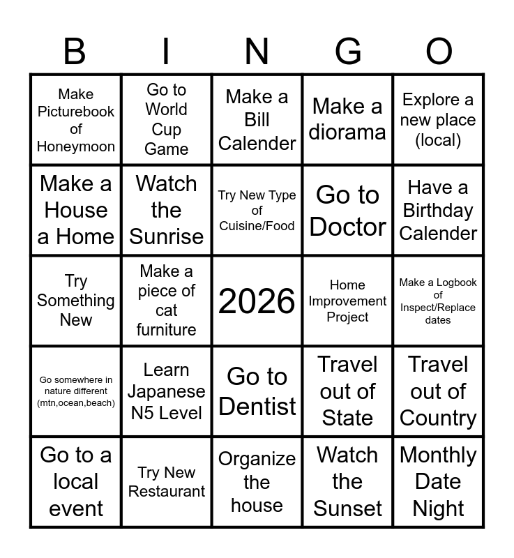 This bingo card has a free space and 24 words: Learn Japanese N5 Level, Try New Restaurant, Try New Type of Cuisine/Food, Go to a local event, Explore a new place (local), Make Picturebook of Honeymoon, Make a House a Home, Go to World Cup Game, Home Improvement Project, Go to Dentist, Go to Doctor, Try Something New, Travel out of State, Travel out of Country, Watch the Sunrise, Watch the Sunset, Make a Logbook of Inspect/Replace dates, Make a Bill Calender, Have a Birthday Calender, Make a piece of cat furniture, Monthly Date Night, Go somewhere in nature different (mtn,ocean,beach), Make a diorama and Organize the house.