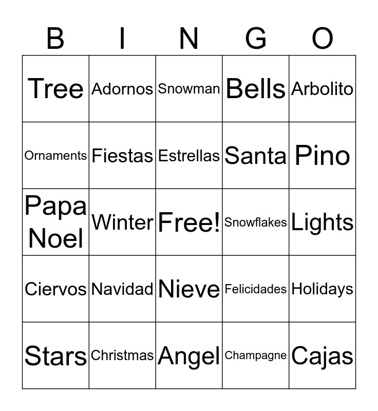 This bingo card has a free space and 24 words: Navidad, Christmas, Estrellas, Stars, Arbolito, Tree, Ornaments, Adornos, Snowflakes, Nieve, Santa, Papa Noel, Felicidades, Holidays, Fiestas, Champagne, Lights, Snowman, Pino, Winter, Cajas, Ciervos, Bells and Angel.