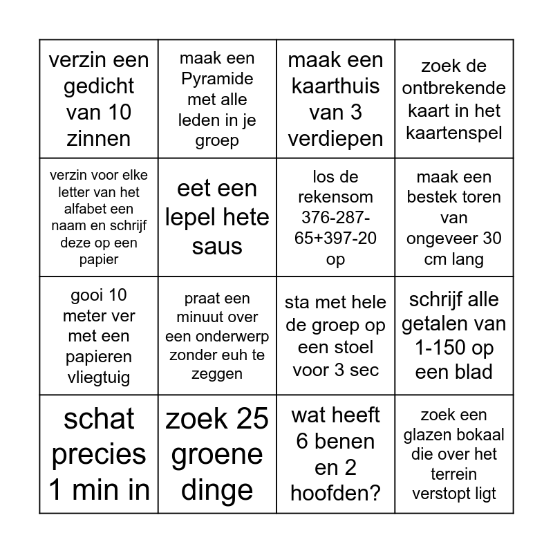 This bingo card has 16 words: zoek 25 groene dinge, schrijf alle getalen van 1-150 op een blad, maak een kaarthuis van 3 verdiepen, verzin een gedicht van 10 zinnen, gooi 10 meter ver met een papieren vliegtuig, maak een Pyramide met alle leden in je groep, sta met hele de groep op een stoel voor 3 sec, wat heeft 6 benen en 2 hoofden?, verzin voor elke letter van het alfabet een naam en schrijf deze op een papier, eet een lepel hete saus, schat precies 1 min in, zoek de ontbrekende kaart in het kaartenspel, praat een minuut over een onderwerp zonder euh te zeggen, maak een bestek toren van ongeveer 30 cm lang, los de rekensom 376-287-65+397-20 op and zoek een glazen bokaal die over het terrein verstopt ligt.