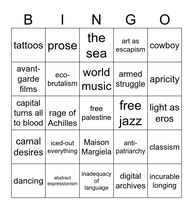 This bingo card has a free space and 24 words: iced-out everything, abstract expressionism, world music, dancing, cowboy, tattoos, avant-garde films, prose, free jazz, Maison Margiela, armed struggle, capital turns all to blood, anti-patriarchy, classism, eco-brutalism, digital archives, light as eros, the sea, apricity, rage of Achilles, incurable longing, carnal desires, art as escapism and inadequacy of language.