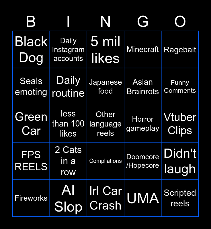 This bingo card has 25 words: 2 Cats in a row, Irl Car Crash, Japanese food, Fireworks, Ragebait, Black Dog, Seals emoting, Daily Instagram accounts, Horror gameplay, Compliations, Asian Brainrots, Green Car, Doomcore /Hopecore, Didn't laugh, Daily routine, Scripted reels, Vtuber Clips, 5 mil likes, Funny Comments, less than 100 likes, Other language reels, AI Slop, FPS REELS, Minecraft and UMA.