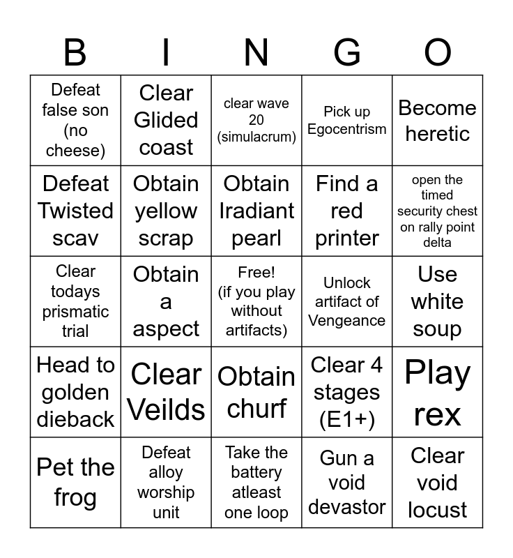 This bingo card has a free space and 24 words: Clear Veilds, Defeat alloy worship unit, Obtain Iradiant pearl, Pet the frog, Become heretic, Defeat false son (no cheese), Defeat Twisted scav, Clear Glided coast, Unlock artifact of Vengeance, Obtain churf, Find a red printer, Clear todays prismatic trial, Clear 4 stages (E1+), Play rex, Obtain yellow scrap, Gun a void devastor, Use white soup, clear wave 20 (simulacrum), open the timed security chest on rally point delta, Obtain a aspect, Clear void locust, Head to golden dieback, Pick up Egocentrism and Take the battery atleast one loop.