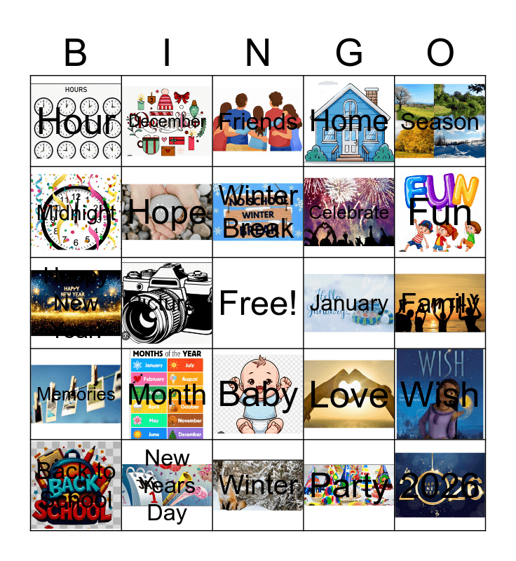 This bingo card has 24 images, a free space and 24 words: Month, New Years Day, Winter Break, Back to School, Season, Hour, Midnight, December, January, Baby, Celebrate, Happy New Year!, Love, Wish, Hope, Party, Family, Friends, Fun, Pictures, 2026, Memories, Home and Winter.