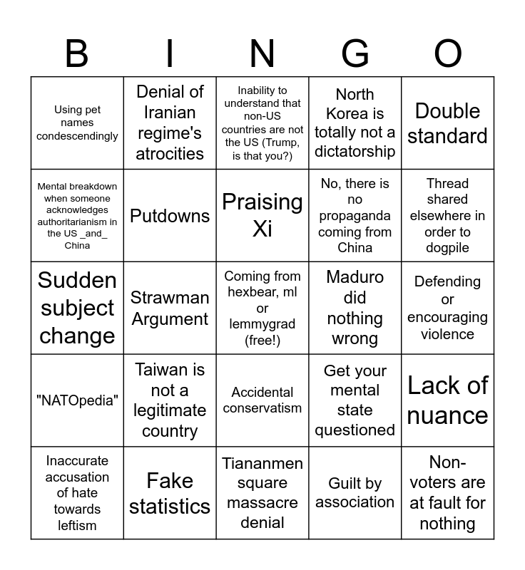 This bingo card has a free space and 49 words: The protests were/are backed by the CIA, Non-voters are at fault for nothing, The CCP simply does what the people want, Tiananmen square massacre denial, Taiwan is not a legitimate country, Political dissent is "allowed" in China, Denial of Iranian regime's atrocities, Ukraine is full of Nazis, Mental breakdown when someone acknowledges authoritarianism in the US _and_ China, Insults, Putdowns, North Korea is totally not a dictatorship, Lack of nuance, Get your mental state questioned, You're just believing the CIA propaganda, Denial of atrocities against Uyghurs, Praising Xi, Maduro did nothing wrong, Justifying political imprisonment (only of certain countries, of course), Double standard, Strawman Argument, Guilt by association, Using pet names condescendingly, No, there is no propaganda coming from China, Praise of the Kremlin, Uses a terrible source, Thread shared elsewhere in order to dogpile, Irrelevant mention of the US, Inability to understand that non-US countries are not the US (Trump, is that you?), Accidental conservatism, Pro-imperialism (generally Russian or Chinese), Lib-slur, You're a fascist!, Empty negation, Fake statistics, Misleading statistics, Have you read theory?, Malfunction due to confrontation with of LGBTQ rights in favorite authoritarian country, Irrelevant mention of Zionism, Defending or encouraging violence, That wasn't real communism, Blaming of problems on the US, Antisemitism, Unexpected consumerism, Inaccurate accusation of hate towards leftism, Sudden subject change, Ignoring inconvenient fact or question, Distracting from the point and "NATOpedia".
