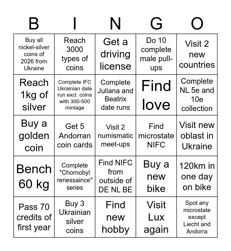 This bingo card has a free space and 24 words: Complete "Chornobyl renessaince" series, Buy 3 Ukrainian silver coins, Complete Juliana and Beatrix date runs, Pass 70 credits of first year, Visit 2 new countries, Buy all nickel-silver coins of 2026 from Ukraine, Reach 1kg of silver, Reach 3000 types of coins, Find microstate NIFC, Find NIFC from outside of DE NL BE, Find love, Buy a golden coin, Buy a new bike, 120km in one day on bike, Complete IFC Ukrainian date run excl. coins with 300-500 mintage, Visit Lux again, Visit new oblast in Ukraine, Get a driving license, Complete NL 5e and 10e collection, Get 5 Andorran coin cards, Spot any microstate except Liecht and Andorra, Bench 60 kg, Do 10 complete male pull-ups and Find new hobby.