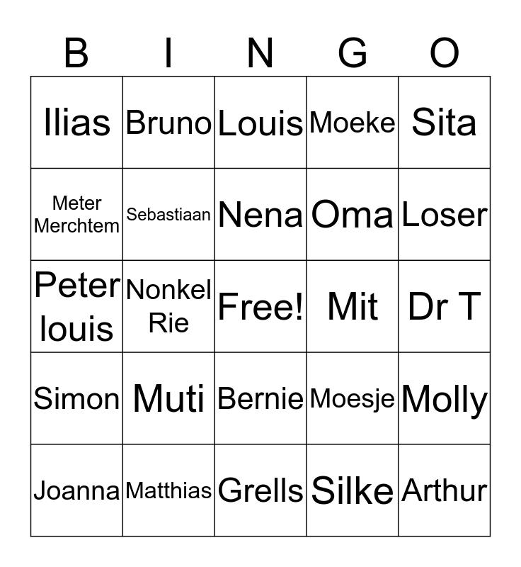This bingo card has a free space and 60 words: Wouter, Matthias, Marlies, Simon, Silke, Evy, Sebastiaan, Sofie, Oma, Opa, Moeke, Vake, Meter Merchtem, Casper, Alexander, Ilias, Arthur, Sita, Torben, Nena, Mit, Louis, Joanna, Molly, Bruintje, Mazzel, Zwartje, Francine, Loser, Travestiet, Ster, Jezus, Basil, Belleke, Bruno, Snoes, Kerstboom, Nonkel Rie, Jean, Peter louis, Meter louis, Muti, Dr T, Bib, Moesje, Wowo, De stoere, Matthi, Ernie, Bernie, Grells, Liesje, Das, Roman, Klauw, Mass, Mieke, Josephine, Robbroeck and Haan.