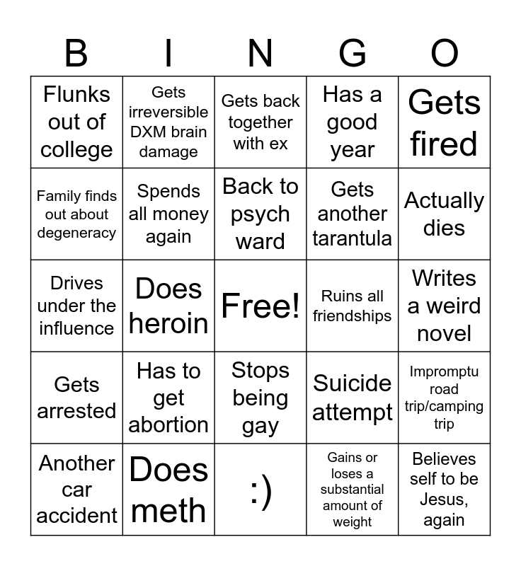 This bingo card has a free space and 24 words: Has to get abortion, Does meth, Back to psych ward, Another car accident, Gets fired, Flunks out of college, Family finds out about degeneracy, Gets irreversible DXM brain damage, Ruins all friendships, Stops being gay, Gets another tarantula, Drives under the influence, Suicide attempt, Impromptu road trip/camping trip, Spends all money again, Gains or loses a substantial amount of weight, Writes a weird novel, Gets back together with ex, Actually dies, Does heroin, Believes self to be Jesus, again, Gets arrested, Has a good year and :).