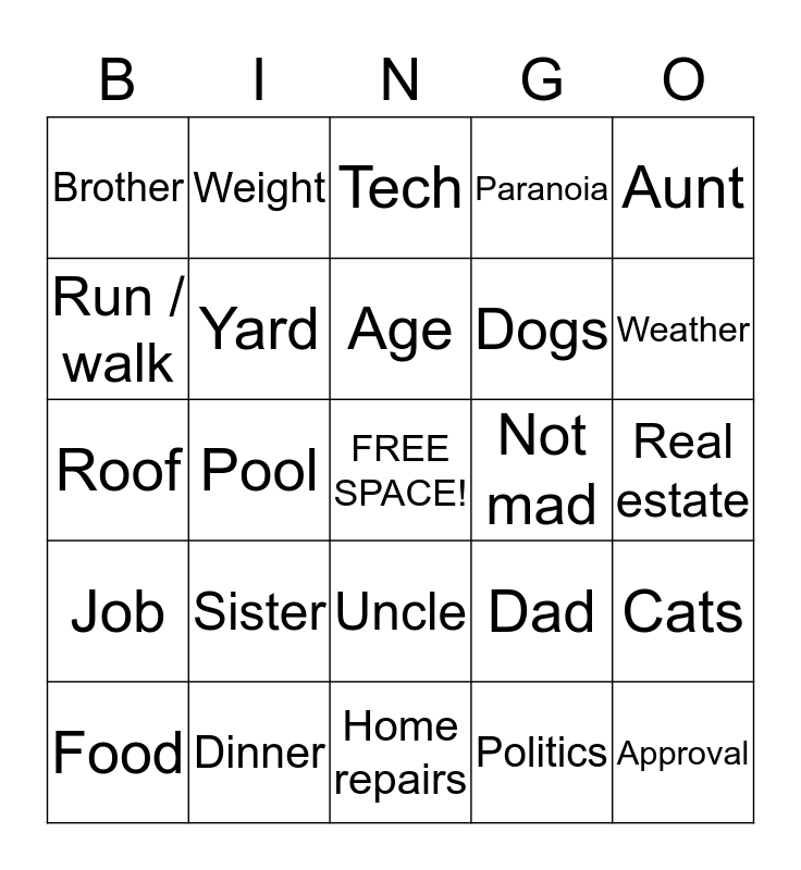 This bingo card has a free space and 24 words: Sister, Dinner, Age, Food, Aunt, Brother, Run / walk, Weight, Not mad, Uncle, Dogs, Roof, Dad, Cats, Yard, Politics, Real estate, Tech, Weather, Pool, Approval, Job, Paranoia and Home repairs.