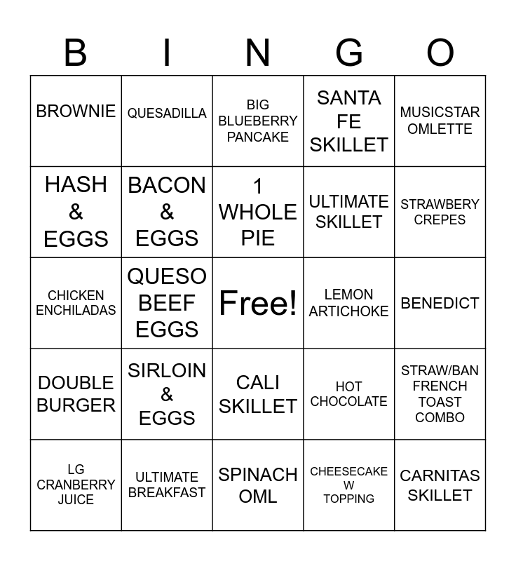 This bingo card has a free space and 24 words: SIRLOIN & EGGS, ULTIMATE BREAKFAST, 1 WHOLE PIE, LG CRANBERRY JUICE, MUSICSTAR OMLETTE, BROWNIE, HASH & EGGS, QUESADILLA, LEMON ARTICHOKE, CALI SKILLET, ULTIMATE SKILLET, CHICKEN ENCHILADAS, HOT CHOCOLATE, STRAW/BAN FRENCH TOAST COMBO, BACON & EGGS, CHEESECAKE W TOPPING, BENEDICT, BIG BLUEBERRY PANCAKE, STRAWBERY CREPES, QUESO BEEF EGGS, CARNITAS SKILLET, DOUBLE BURGER, SANTA FE SKILLET and SPINACH OML.