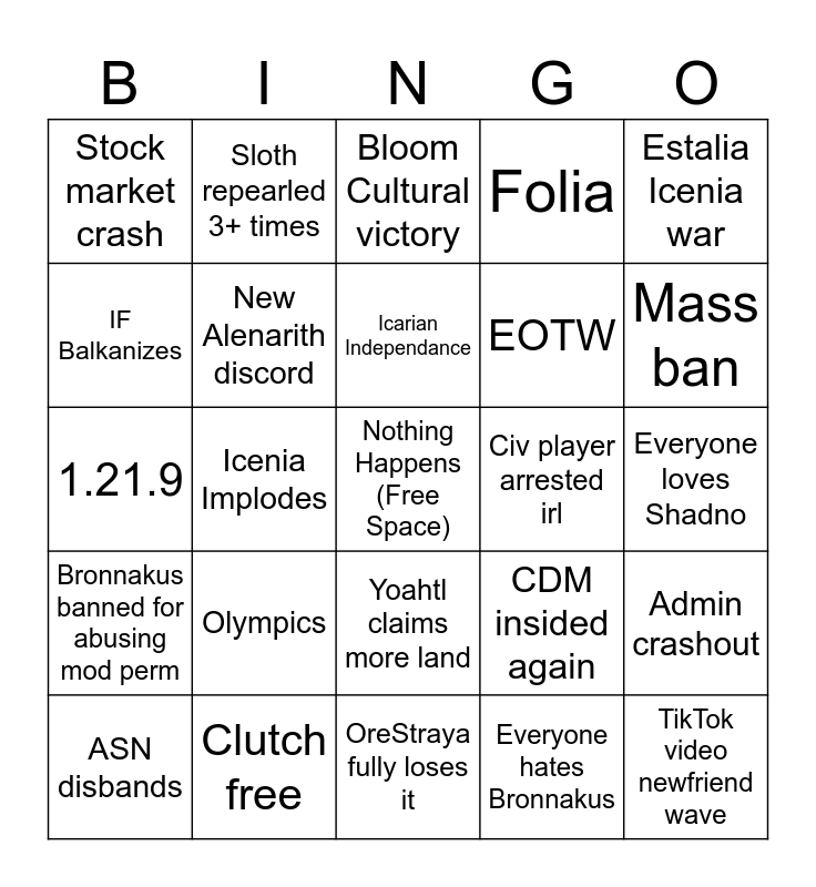 This bingo card has a free space and 24 words: Olympics, Clutch free, Icarian Independance, ASN disbands, Estalia Icenia war, Stock market crash, IF Balkanizes, Sloth repearled 3+ times, Civ player arrested irl, Yoahtl claims more land, EOTW, 1.21.9, CDM insided again, Admin crashout, New Alenarith discord, Everyone hates Bronnakus, Everyone loves Shadno, Bloom Cultural victory, Mass ban, Icenia Implodes, TikTok video newfriend wave, Bronnakus banned for abusing mod perm, Folia and OreStraya fully loses it.