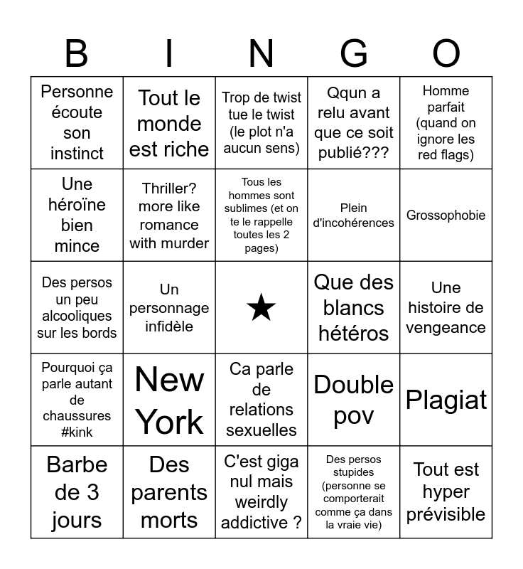 This bingo card has a free space and 24 words: New York, Des parents morts, Tous les hommes sont sublimes (et on te le rappelle toutes les 2 pages), Barbe de 3 jours, Homme parfait (quand on ignore les red flags), Personne écoute son instinct, Une héroïne bien mince, Tout le monde est riche, Que des blancs hétéros, Ca parle de relations sexuelles, Plein d'incohérences, Des persos un peu alcooliques sur les bords, Double pov, Plagiat, Thriller? more like romance with murder, Des persos stupides (personne se comporterait comme ça dans la vraie vie), Une histoire de vengeance, Trop de twist tue le twist (le plot n'a aucun sens), Grossophobie, Un personnage infidèle, Tout est hyper prévisible, Pourquoi ça parle autant de chaussures #kink, Qqun a relu avant que ce soit publié??? and C'est giga nul mais weirdly addictive ?.