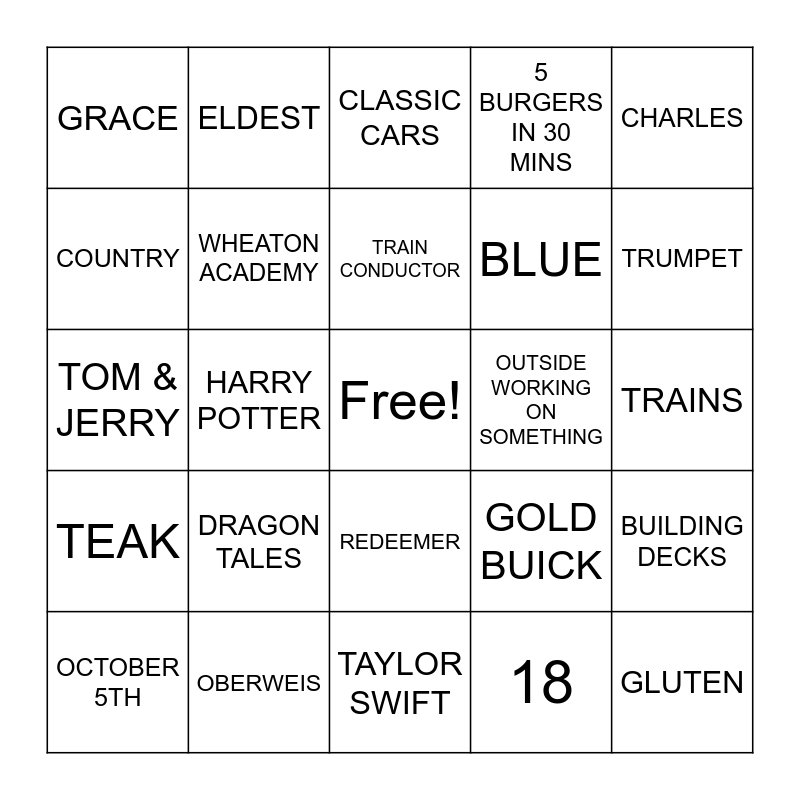 This bingo card has a free space and 24 words: DRAGON TALES, OBERWEIS, TRAIN CONDUCTOR, OCTOBER 5TH, CHARLES, GRACE, COUNTRY, ELDEST, OUTSIDE WORKING ON SOMETHING, REDEEMER, BLUE, TOM & JERRY, GOLD BUICK, BUILDING DECKS, WHEATON ACADEMY, 18, TRAINS, CLASSIC CARS, TRUMPET, HARRY POTTER, GLUTEN, TEAK, 5 BURGERS IN 30 MINS and TAYLOR SWIFT.