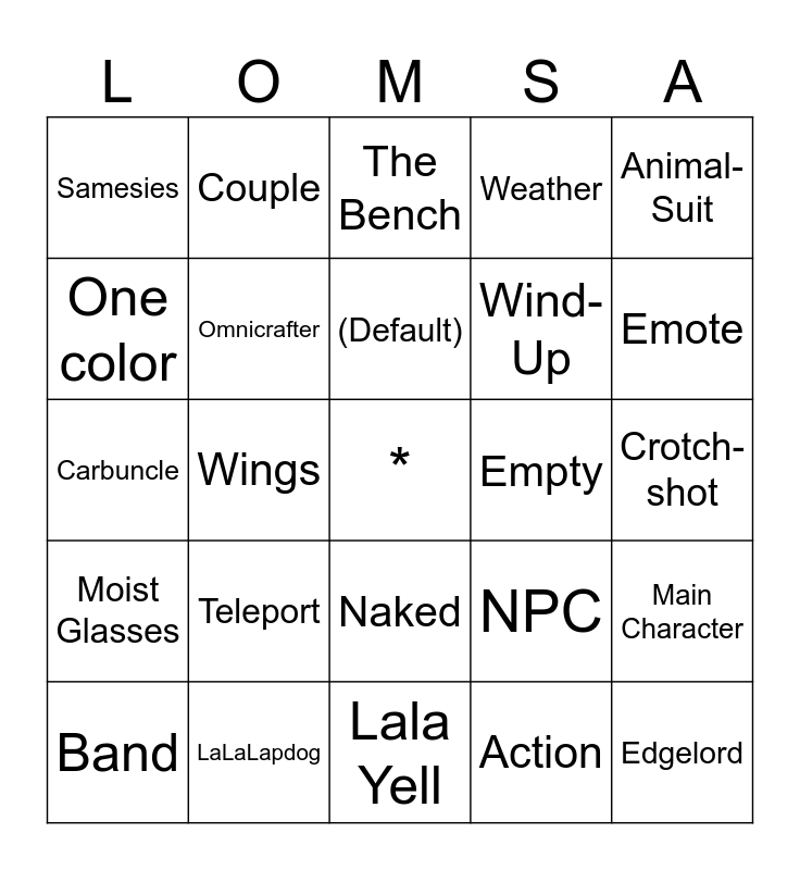 This bingo card has a free space and 24 words: Teleport, LaLaLapdog, (Default), Band, Animal-Suit, Samesies, One color, Couple, Empty, Naked, Wind-Up, Carbuncle, NPC, Main Character, Omnicrafter, Action, Crotch-shot, The Bench, Emote, Wings, Edgelord, Moist Glasses, Weather and Lala Yell.