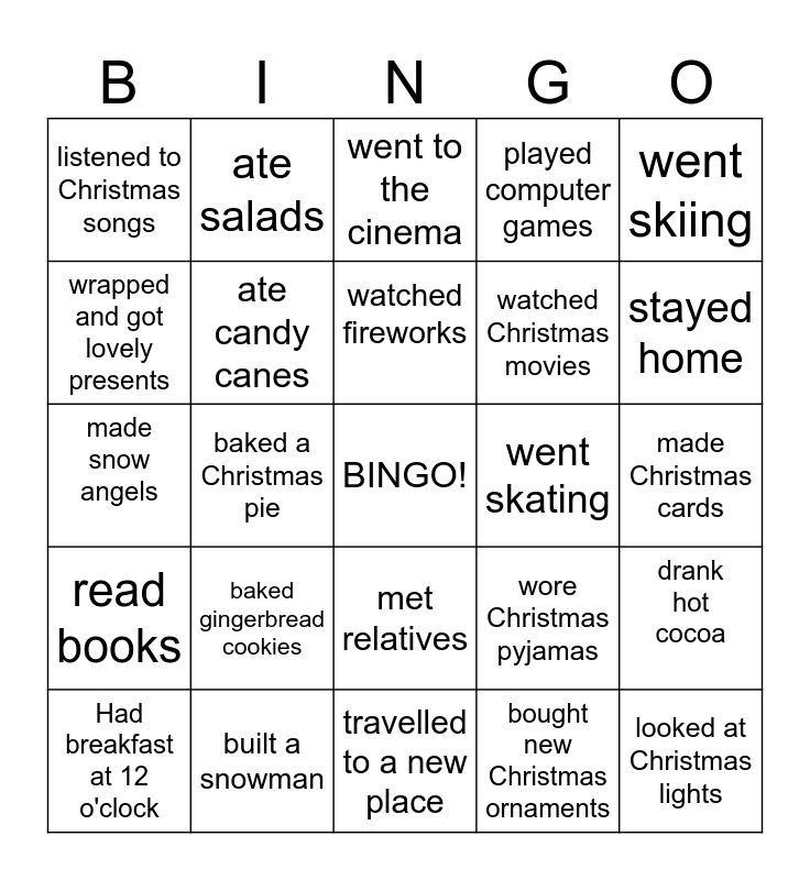 This bingo card has a free space and 24 words: baked gingerbread cookies, built a snowman, watched fireworks, Had breakfast at 12 o'clock, went skiing, listened to Christmas songs, wrapped and got lovely presents, ate salads, went skating, met relatives, watched Christmas movies, made snow angels, wore Christmas pyjamas, drank hot cocoa, ate candy canes, bought new Christmas ornaments, made Christmas cards, went to the cinema, stayed home, baked a Christmas pie, looked at Christmas lights, read books, played computer games and travelled to a new place.
