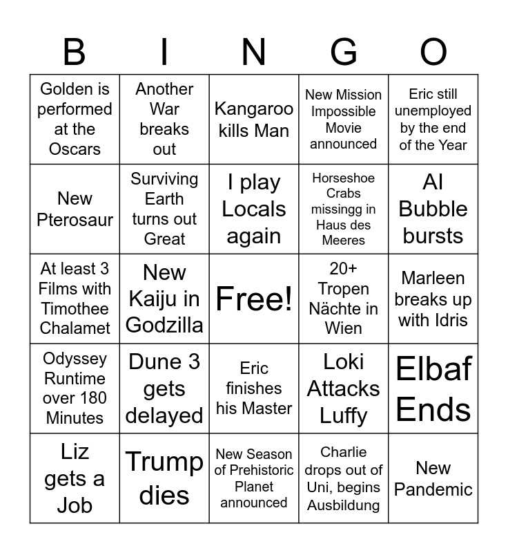 This bingo card has a free space and 24 words: Dune 3 gets delayed, Trump dies, I play Locals again, Liz gets a Job, Eric still unemployed by the end of the Year, Golden is performed at the Oscars, New Pterosaur, Another War breaks out, 20+ Tropen Nächte in Wien, Eric finishes his Master, Horseshoe Crabs missingg in Haus des Meeres, At least 3 Films with Timothee Chalamet, Loki Attacks Luffy, Elbaf Ends, Surviving Earth turns out Great, Charlie drops out of Uni, begins Ausbildung, Marleen breaks up with Idris, Kangaroo kills Man, AI Bubble bursts, New Kaiju in Godzilla, New Pandemic, Odyssey Runtime over 180 Minutes, New Mission Impossible Movie announced and New Season of Prehistoric Planet announced.