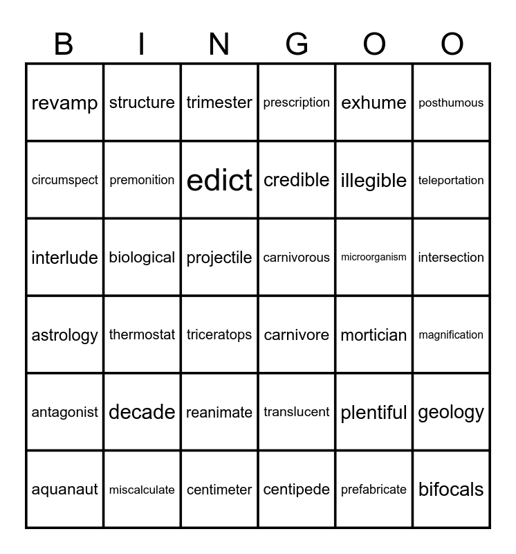 This bingo card has 76 words: unitlateral, bifocals, trimester, quadrilateral, pentathlon, decagon, centipede, decimeter, centimeter, pianist, antagonist, deflation, premonition, posthumous, subterranean, teleportation, translucent, interlude, Free!, exhume, miscalculate, illegible, circumspect, structure, prescription, portable, habitat, phonics, chronological, hydrosphere, aquanaut, bioluminescent, geothermal, astrology, credible, edict, infraction, grapheme, projectile, magnification, immobile, multiples, octagon, bilateral, pentagon, decade, triceratops, revamp, cooperative, transparent, reanimate, intersection, centigrade, prefabricate, pliable, sugarless, plentiful, denominator, subordinate, telegraph, microorganism, extraction, misplace, interpret, immoral, spectacle, biological, geology, geography, antibiotics, thermostat, carnivorous, carnivore, mortal, mortician and phonograph.
