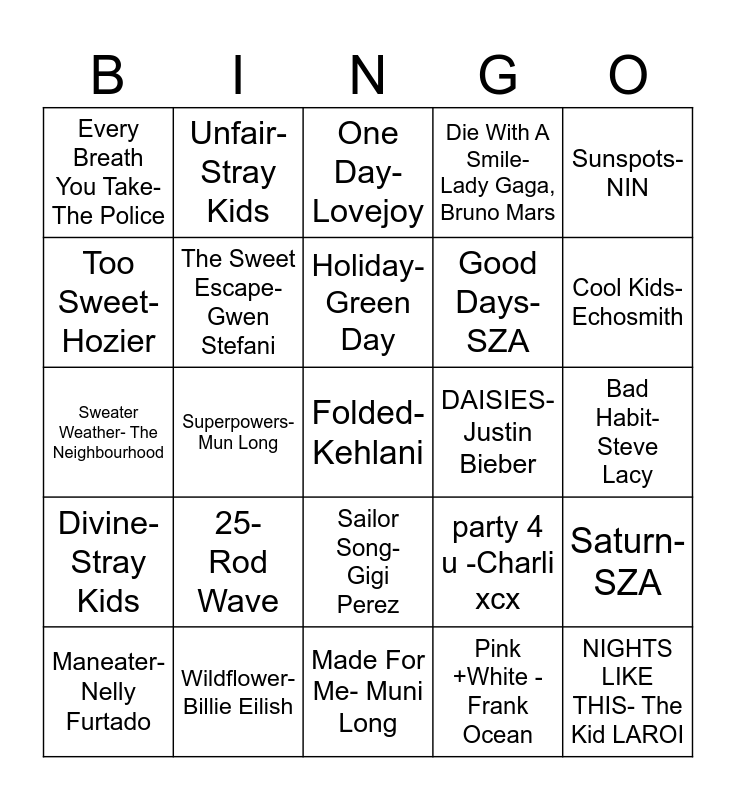This bingo card has a free space and 24 words: 25- Rod Wave, Wildflower- Billie Eilish, Holiday- Green Day, Maneater-Nelly Furtado, Sunspots- NIN, Every Breath You Take- The Police, Too Sweet- Hozier, Unfair- Stray Kids, DAISIES- Justin Bieber, Sailor Song- Gigi Perez, Good Days- SZA, Sweater Weather- The Neighbourhood, party 4 u -Charli xcx, Saturn- SZA, The Sweet Escape-Gwen Stefani, Pink +White -Frank Ocean, Bad Habit- Steve Lacy, One Day- Lovejoy, Cool Kids- Echosmith, Superpowers- Mun Long, NIGHTS LIKE THIS- The Kid LAROI, Divine- Stray Kids, Die With A Smile- Lady Gaga, Bruno Mars and Made For Me- Muni Long.
