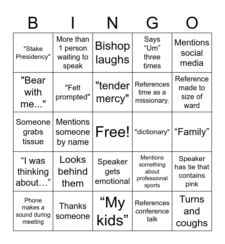 This bingo card has a free space and 41 words: Goes over 10:55, Someone grabs tissue, "sustain", "Felt prompted", Thanks someone, Speaker gets emotional, "tender mercy", “Hymn”, Mentions social media, “I was thinking about…”, Mentions someone by name, Says “Um” three times, Turns and coughs, “Family”, "dictionary", Looks behind them, References a previous talk, "Stake Presidency", Stake President mentioned, Bishop laughs, Speaker has tie that contains pink, “Come follow me”, “My kids”, References time as a missionary., Touches Microphone, Talks about their calling, References conference talk, Baby cries, Reference made to size of ward, Talks about a temple, Visual aid of some kind is used, More than 1 person waiting to speak, Phone makes a sound during meeting, Talks about traveling somewhere, Mentions something about professional sports, "Bear with me...", Tells joke where many people laugh, Touches the microphone, Podium moves, Says word in another language and Story you've heard before.