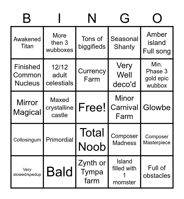 This bingo card has a free space and 24 words: Primordial, Bald, Currency Farm, Very slowed/spedup, Amber island Full song, Awakened Titan, Finished Common Nucleus, More then 3 wubboxes, Minor Carnival Farm, Total Noob, Very Well deco'd, Mirror Magical, Composer Madness, Composer Masterpiece, 12/12 adult celestials, Island filled with 1 momster, Glowbe, Tons of biggifieds, Min. Phase 3 gold epic wubbox, Maxed crystalline castle, Full of obstacles, Collosingum, Seasonal Shanty and Zynth or Tympa farm.