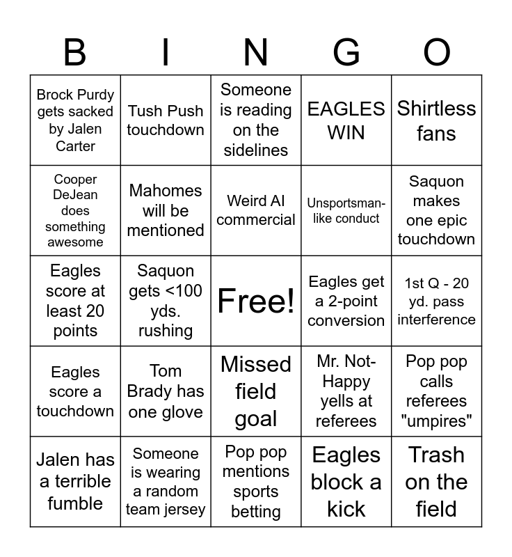 This bingo card has a free space and 25 words: Tom Brady has one glove, Pop pop mentions sports betting, Weird AI commercial, Jalen has a terrible fumble, Shirtless fans, Brock Purdy gets sacked by Jalen Carter, Cooper DeJean does something awesome, Tush Push touchdown, Eagles get a 2-point conversion, Missed field goal, Unsportsman- like conduct, Eagles score at least 20 points, Mr. Not-Happy yells at referees, Pop pop calls referees "umpires", Mahomes will be mentioned, Snow flurries, 1st Q - 20 yd. pass interference, Someone is reading on the sidelines, Saquon makes one epic touchdown, Saquon gets <100 yds. rushing, Trash on the field, Someone is wearing a random team jersey, Eagles score a touchdown, EAGLES WIN and Eagles block a kick.