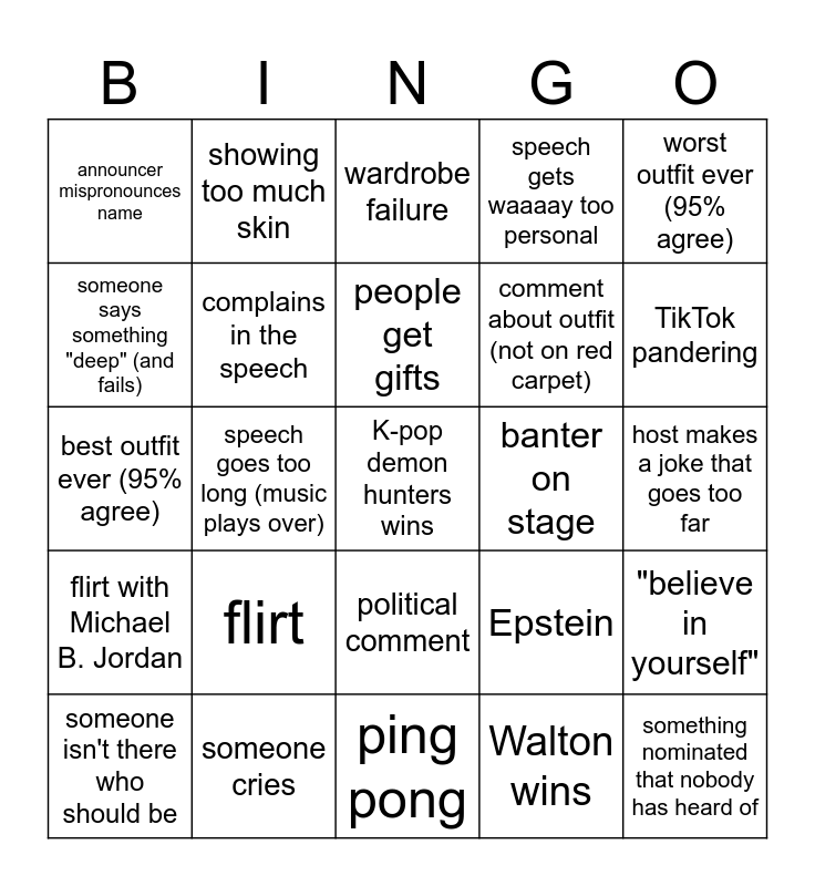 This bingo card has 30 words: someone cries, thanking parents, speech goes too long (music plays over), thanking god, announcer mispronounces name, wardrobe failure, complains in the speech, political comment, banter on stage, ping pong, host makes a joke that goes too far, K-pop demon hunters wins, Walton wins, something nominated that nobody has heard of, TikTok pandering, kylie Jenner booty, Epstein, flirt with Michael B. Jordan, flirt, worst outfit ever (95% agree), best outfit ever (95% agree), dresses up in costume, showing too much skin, comment about outfit (not on red carpet), someone says something "deep" (and fails), speech gets waaaay too personal, "believe in yourself", someone isn't there who should be, people get gifts and gross kiss.
