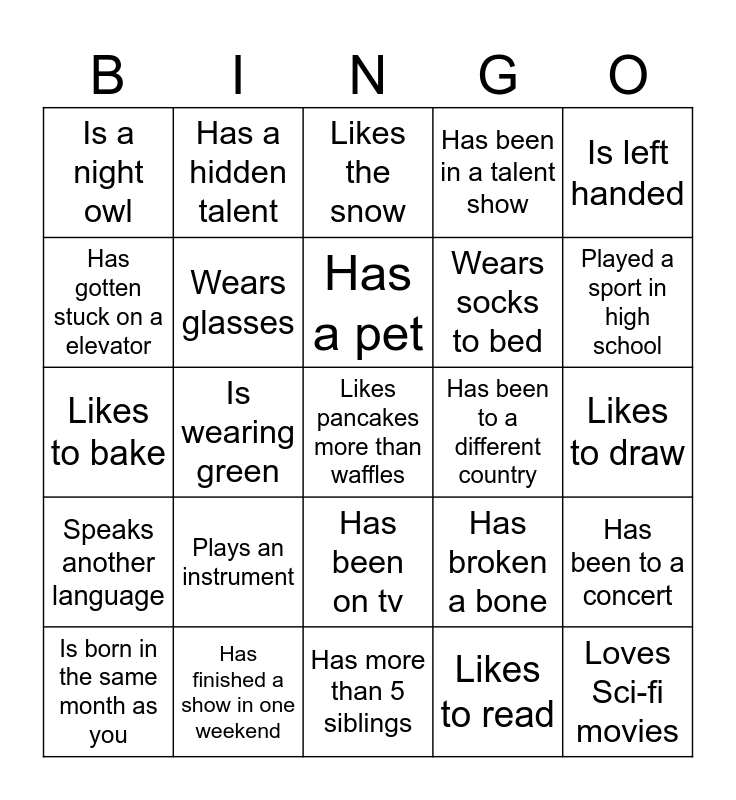 This bingo card has 25 words: Plays an instrument, Has more than 5 siblings, Has a pet, Is born in the same month as you, Is left handed, Is a night owl, Has gotten stuck on a elevator, Has a hidden talent, Has been to a different country, Has been on tv, Wears socks to bed, Likes to bake, Has broken a bone, Has been to a concert, Wears glasses, Loves Sci-fi movies, Likes to draw, Likes the snow, Played a sport in high school, Is wearing green, Likes pancakes more than waffles, Has finished a show in one weekend, Speaks another language, Has been in a talent show and Likes to read.