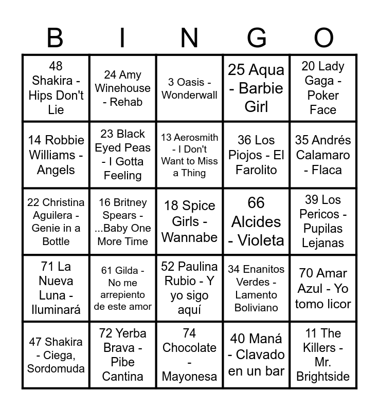 This bingo card has 75 words: 1 Nirvana - Smells Like Teen Spirit, 2 Bon Jovi - It's My Life, 3 Oasis - Wonderwall, 4 Linkin Park - In the End, 5 Evanescence - Bring Me to Life, 6 Blink-182 - All the Small Things, 7 Green Day - American Idiot, 8 Red Hot Chili Peppers - Californication, 9 R.E.M. - Losing My Religion, 10 No Doubt - Don't Speak, 11 The Killers - Mr. Brightside, 12 Coldplay - Yellow, 13 Aerosmith - I Don't Want to Miss a Thing, 14 Robbie Williams - Angels, 15 Guns N' Roses - November Rain, 16 Britney Spears - ...Baby One More Time, 17 Backstreet Boys - Everybody, 18 Spice Girls - Wannabe, 19 Madonna - Hung Up, 20 Lady Gaga - Poker Face, 21 Rihanna - Umbrella, 22 Christina Aguilera - Genie in a Bottle, 23 Black Eyed Peas - I Gotta Feeling, 24 Amy Winehouse - Rehab, 25 Aqua - Barbie Girl, 26 Lou Bega - Mambo No. 5, 27 Corona - The Rhythm of the Night, 28 Gala - Freed from Desire, 29 OutKast - Hey Ya!, 30 Hanson - MMMBop, 31 Soda Stereo - De Música Ligera, 32 Los Fabulosos Cadillacs - Matador, 33 Los Auténticos Decadentes - La Guitarra, 34 Enanitos Verdes - Lamento Boliviano, 35 Andrés Calamaro - Flaca, 36 Los Piojos - El Farolito, 37 Bersuit Vergarabat - Yo Tomo, 38 Turf - Pasos al costado, 39 Los Pericos - Pupilas Lejanas, 40 Maná - Clavado en un bar, 41 Vicentico - Los Caminos de la Vida, 42 Julieta Venegas - Limón y Sal, 43 La Mosca - Para no verte más, 44 Vilma Palma e Vampiros - Auto Rojo, 45 Babasónicos - Irresponsables, 46 Ricky Martin - Livin' la Vida Loca, 47 Shakira - Ciega, Sordomuda, 48 Shakira - Hips Don't Lie, 49 Chayanne - Provócame, 50 Luis Miguel - Suave, 51 Thalía - Arrasando, 52 Paulina Rubio - Y yo sigo aquí, 53 Juanes - La Camisa Negra, 54 Daddy Yankee - Gasolina, 55 Don Omar - Dale Don Dale, 56 Wisin & Yandel - Rakata, 57 Calle 13 - Atrévete-te-te, 58 Aventura - Obsesión, 59 Celia Cruz - La Vida es un Carnaval, 60 King África - La Bomba, 61 Gilda - No me arrepiento de este amor, 62 Ráfaga - La Luna y Tú, 63 Ráfaga - Mentirosa, 64 Grupo Sombras - La Ventanita, 65 Antonio Rios - Nunca me faltes, 66 Alcides - Violeta, 67 Rodrigo - Soy Cordobés, 68 Walter Olmos - Por lo que yo te quiero, 69 Los Palmeras - Bombón Asesino, 70 Amar Azul - Yo tomo licor, 71 La Nueva Luna - Iluminará, 72 Yerba Brava - Pibe Cantina, 73 Damas Gratis - Se te ve la tanga, 74 Chocolate - Mayonesa and 75 Las Ketchup - Aserejé.