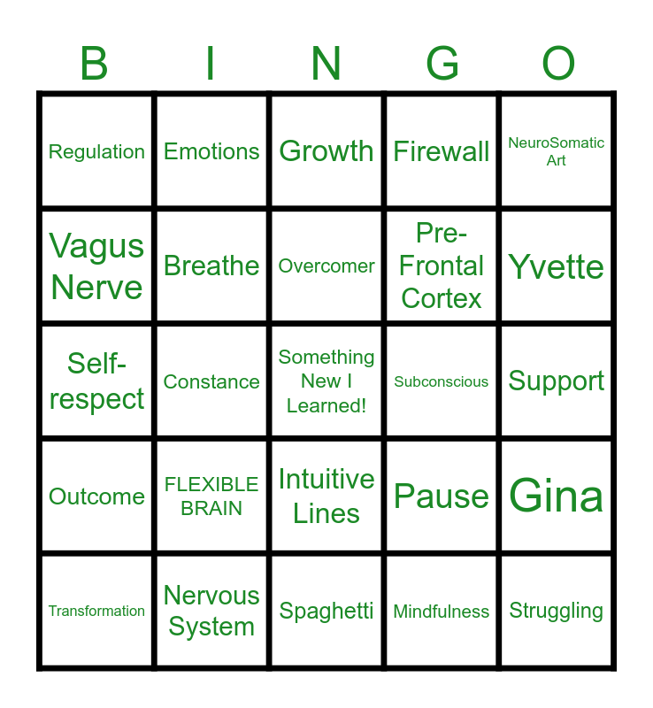 This bingo card has a free space and 24 words: FLEXIBLE BRAIN, Nervous System, Overcomer, Transformation, NeuroSomatic Art, Regulation, Vagus Nerve, Emotions, Subconscious, Intuitive Lines, Pre-Frontal Cortex, Self-respect, Pause, Gina, Breathe, Mindfulness, Support, Growth, Yvette, Constance, Struggling, Outcome, Firewall and Spaghetti.
