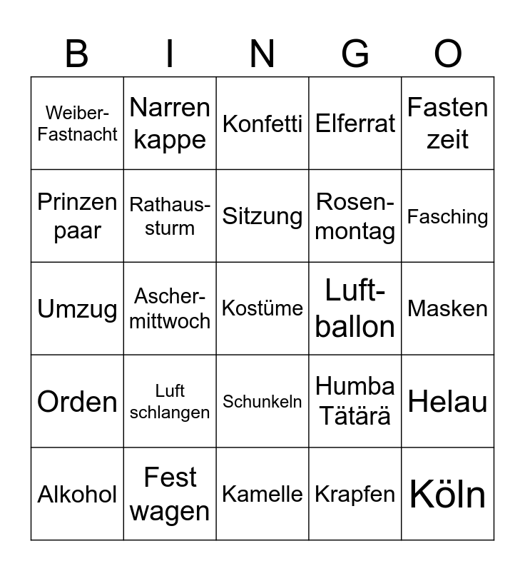This bingo card has a free space and 24 words: Luft schlangen, Fest wagen, Sitzung, Alkohol, Fasten zeit, Weiber- Fastnacht, Prinzen paar, Narren kappe, Luft- ballon, Schunkeln, Rosen- montag, Umzug, Humba Tätärä, Helau, Rathaus- sturm, Krapfen, Masken, Konfetti, Fasching, Ascher- mittwoch, Köln, Orden, Elferrat and Kamelle.