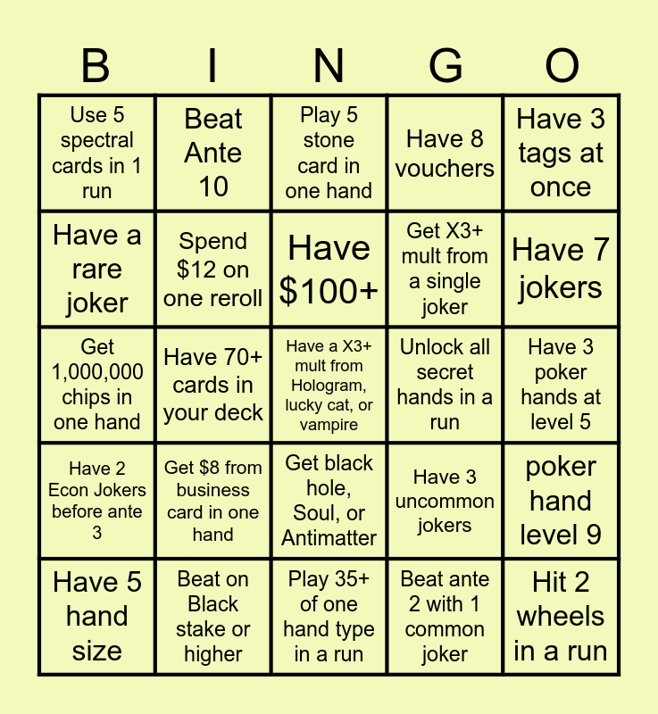 This bingo card has 25 words: Get $8 from business card in one hand, Play 35+ of one hand type in a run, Have $100+, Have 5 hand size, Have 3 tags at once, Use 5 spectral cards in 1 run, Have a rare joker, Beat Ante 10, Unlock all secret hands in a run, Get black hole, Soul, or Antimatter, Get X3+ mult from a single joker, Get 1,000,000 chips in one hand, Have 3 uncommon jokers, poker hand level 9, Spend $12 on one reroll, Hit 2 wheels in a run, Have 3 poker hands at level 5, Play 5 stone card in one hand, Have 7 jokers, Have 70+ cards in your deck, Have a X3+ mult from Hologram, lucky cat, or vampire, Beat on Black stake or higher, Have 2 Econ Jokers before ante 3, Have 8 vouchers and Beat ante 2 with 1 common joker.