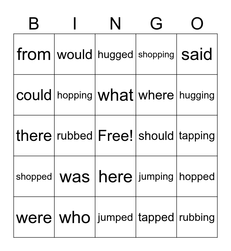 This bingo card has a free space and 24 words: was, who, what, were, said, from, could, would, should, here, where, there, jumping, hopped, hopping, tapped, tapping, hugged, hugging, rubbed, rubbing, shopped, shopping and jumped.