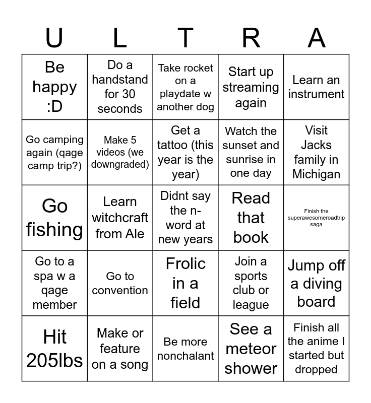 This bingo card has a free space and 24 words: Go to convention, Make or feature on a song, Get a tattoo (this year is the year), Hit 205lbs, Learn an instrument, Be happy :D, Go camping again (qage camp trip?), Do a handstand for 30 seconds, Read that book, Frolic in a field, Watch the sunset and sunrise in one day, Go fishing, Join a sports club or league, Jump off a diving board, Make 5 videos (we downgraded), See a meteor shower, Finish the superawesomeroadtrip saga, Take rocket on a playdate w another dog, Visit Jacks family in Michigan, Learn witchcraft from Ale, Finish all the anime I started but dropped, Go to a spa w a qage member, Start up streaming again and Be more nonchalant.