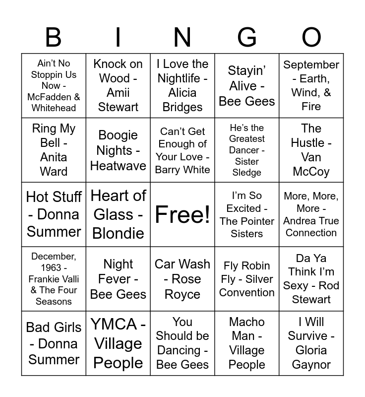 This bingo card has a free space and 43 words: Funky Town - Lipps Inc., I Will Survive - Gloria Gaynor, Le Freak - CHIC, Bad Girls - Donna Summer, Super Freak - Rick James, Macho Man - Village People, I Love the Nightlife - Alicia Bridges, Disco Inferno - The Trammps, September - Earth, Wind, & Fire, YMCA - Village People, Stayin’ Alive - Bee Gees, I’m So Excited - The Pointer Sisters, Car Wash - Rose Royce, Night Fever - Bee Gees, That’s the Way (I Like It) - KC & the Sunshine Band, You Should be Dancing - Bee Gees, We are Family - Sister Sledge, Hot Stuff - Donna Summer, Dancing Queen - ABBA, The Hustle - Van McCoy, Knock on Wood - Amii Stewart, Never Can Say Goodbye - Gloria Gaynor, Rock the Boat - Hues Corporation, Ain’t No Stoppin Us Now - McFadden & Whitehead, Heaven Must Be Missing an Angel - Tavares, More, More, More - Andrea True Connection, Shame - Evelyn “Champagne” King, Turn the Beat Around - Vicki Sue Robinson, Fly Robin Fly - Silver Convention, December, 1963 - Frankie Valli & The Four Seasons, On the Radio - Donna Summer, Da Ya Think I’m Sexy - Rod Stewart, Don’t Leave Me This Way - Thelma Houston, Heart of Glass - Blondie, Love Train - The O’Jays, Get Down Tonight - KC & The Sunshine, Miss You - Rolling Stones, Can’t Get Enough of Your Love - Barry White, Ring My Bell - Anita Ward, He’s the Greatest Dancer - Sister Sledge, Brick House - Commodores, Boogie Nights - Heatwave and Boogie Oogie Oogie - A Taste of Honey.
