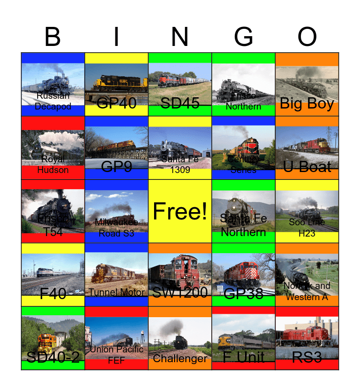 This bingo card has 24 images, a free space and 24 words: Tunnel Motor, Union Pacific FEF, Santa Fe 1309, SD40-2, Big Boy, Russian Decapod, Royal Hudson, GP40, Santa Fe Northern, SW1200, Century Series, Frisco T54, GP38, Norfolk and Western A, GP9, F Unit, Soo Line H23, SD45, U Boat, Milwaukee Road S3, RS3, F40, Frisco Northern and Challenger.