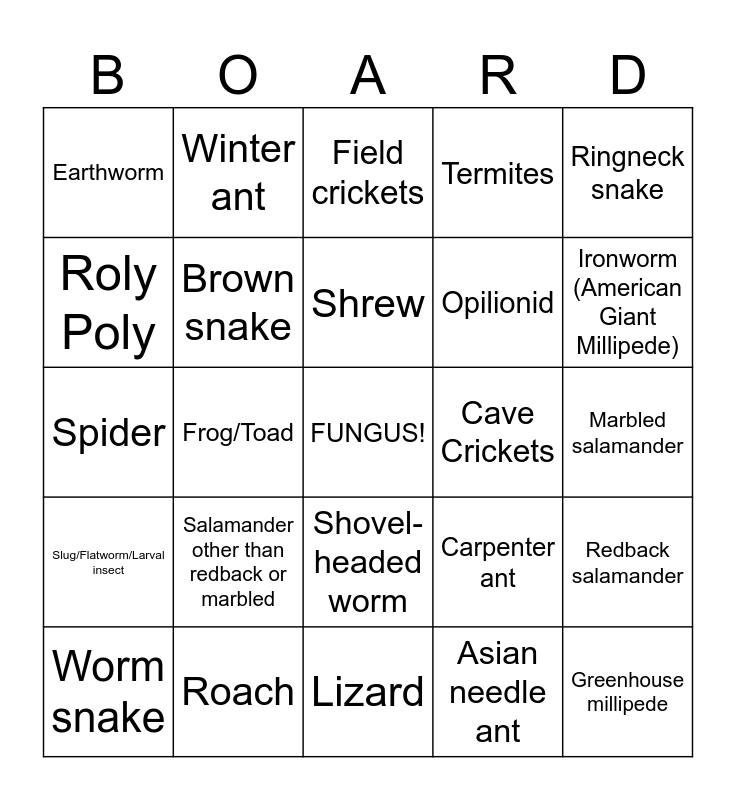 This bingo card has a free space and 31 words: Lizard, Beetle, Frog/Toad, Centipede, Earthworm, Field crickets, Brown snake, Carpenter ant, Cave Crickets, Asian needle ant, Marbled salamander, Greenhouse millipede, Greenhouse millipede, Bigger snake (garter, racer, black), Ironworm (American Giant Millipede), Mouse, nest or tunnel, Redback salamander, Salamander other than redback or marbled, Slug/Flatworm/Larval insect, Shovel-headed worm, Ringneck snake, Other insect, Worm snake, Winter ant, Opilionid, Roly Poly, Termites, Spider, Roach, Shrew and Snail.
