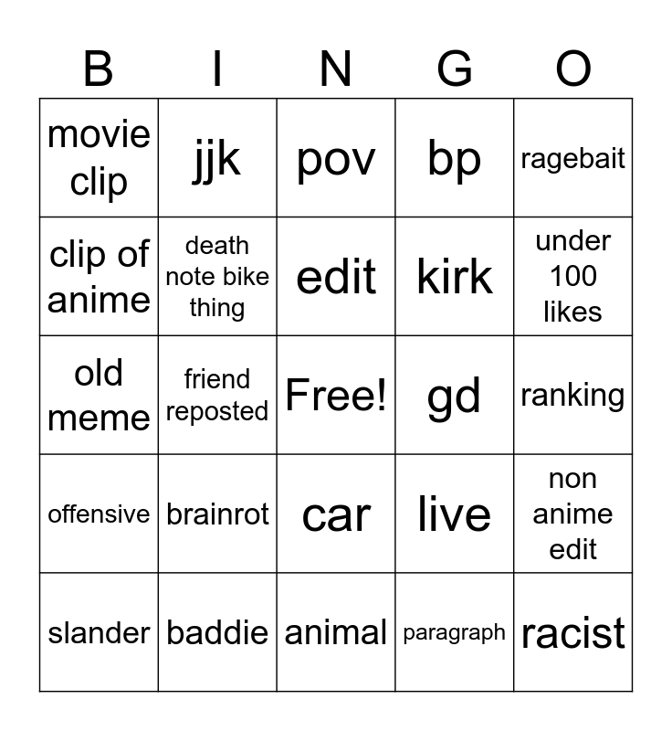 This bingo card has a free space and 24 words: brainrot, baddie, edit, slander, ragebait, movie clip, clip of anime, jjk, gd, car, kirk, old meme, live, non anime edit, death note bike thing, paragraph, ranking, pov, under 100 likes, friend reposted, racist, offensive, bp and animal.