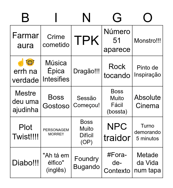 This bingo card has a free space and 24 words: PERSONAGEM MORRE!!, "Ah tá em élfico" (inglês), Dragão!!!, Diabo!!!, Monstro!!!, Farmar aura, ☝️🤓 errh na verdade, Crime cometido, Boss Muito Fácil (bossta), Boss Muito Difícil (OP), Rock tocando, Mestre deu uma ajudinha, NPC traidor, Turno demorando 5 minutos, Música Épica Intesifies, #Fora-de-Contexto, Absolute Cinema, TPK, Pinto de Inspiração, Boss Gostoso, Metade da Vida num tapa, Plot Twist!!!!, Número 51 aparece and Foundry Bugando.