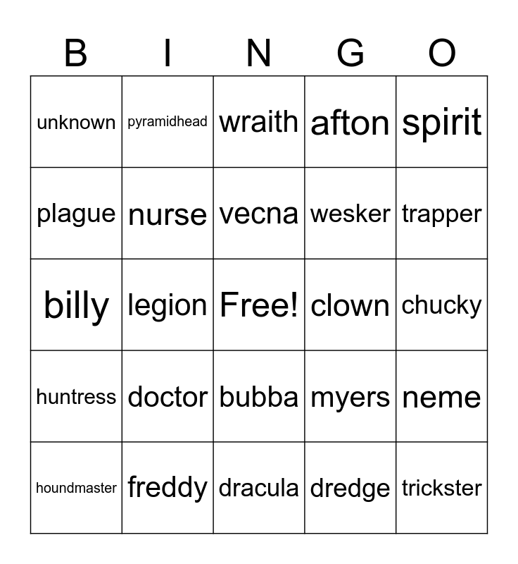 This bingo card has a free space and 24 words: doctor, freddy, vecna, houndmaster, spirit, unknown, plague, pyramidhead, clown, bubba, wesker, billy, myers, neme, nurse, dredge, chucky, wraith, trapper, legion, trickster, huntress, afton and dracula.