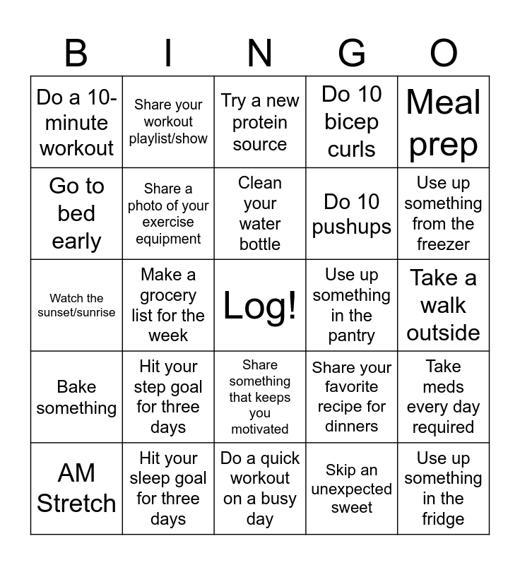 This bingo card has a free space and 55 words: Try a new exercise, AM Stretch, PM Stretch, Do a 10-minute workout, Do a quick workout on a busy day, Share your favorite workout vid in Discord, Share a photo of your exercise equipment, Do 10 jumping jacks, Do 10 pushups, Do 10 squats, Do 10 bicep curls, Do 10 leg lifts, Do a 10 second plank, Share a photo of your breakfast, Share a photo of your lunch, Share a photo of your dinner, Meal prep, Make a grocery list for the week, Stick to your meal plan for a day, Use up something in the fridge, Use up something in the pantry, Have a meal with more than 3 colors, Share your favorite recipe for dinners, Try a new protein source, Meatless Monday, Clean your water bottle, Skip an unexpected sweet, Journal, Take a walk outside, Take meds every day required, Share a pet photo, Share a nature photo, Do a chore you’ve been putting off, Declutter something you don’t need, Go to bed early, Watch the sunset/sunrise, Workout with a buddy, Bake something, Use a new cooking method (slow cooker, air fry), Share 3 things you’re grateful for, Share your workout playlist/show, Do some self care, Eat a fruit you usually don’t have, Eat a vegetable you usually don’t have, Hit your step goal for three days, Hit your sleep goal for three days, Make an exercise schedule for the week, Have a no spend day, Double your step goal, Use up something from the freezer, Hit your hydration goal, Encourage someone else to hydrate, Do a buddy workout (virtually or in person!), Share something that keeps you motivated and Share a tip you wish you'd had earlier.