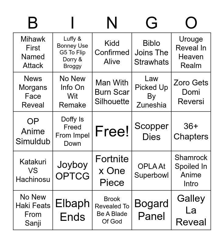 This bingo card has a free space and 24 words: Joyboy OPTCG, Elbaph Ends, Man With Burn Scar Silhouette, No New Haki Feats From Sanji, Urouge Reveal In Heaven Realm, Mihawk First Named Attack, News Morgans Face Reveal, Luffy & Bonney Use G5 To Flip Dorry & Broggy, Scopper Dies, Fortnite x One Piece, Law Picked Up By Zuneshia, OP Anime Simuldub, OPLA At Superbowl, Shamrock Spoiled In Anime Intro, No New Info On Wit Remake, Bogard Panel, 36+ Chapters, Kidd Confirmed Alive, Zoro Gets Domi Reversi, Doffy Is Freed From Impel Down, Galley La Reveal, Katakuri VS Hachinosu, Biblo Joins The Strawhats and Brook Revealed To Be A Blade Of God.