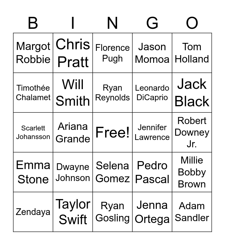 This bingo card has a free space and 24 words: Dwayne Johnson, Taylor Swift, Ryan Reynolds, Zendaya, Tom Holland, Margot Robbie, Timothée Chalamet, Chris Pratt, Jennifer Lawrence, Selena Gomez, Leonardo DiCaprio, Scarlett Johansson, Pedro Pascal, Millie Bobby Brown, Will Smith, Jenna Ortega, Robert Downey Jr., Florence Pugh, Jack Black, Ariana Grande, Adam Sandler, Emma Stone, Jason Momoa and Ryan Gosling.
