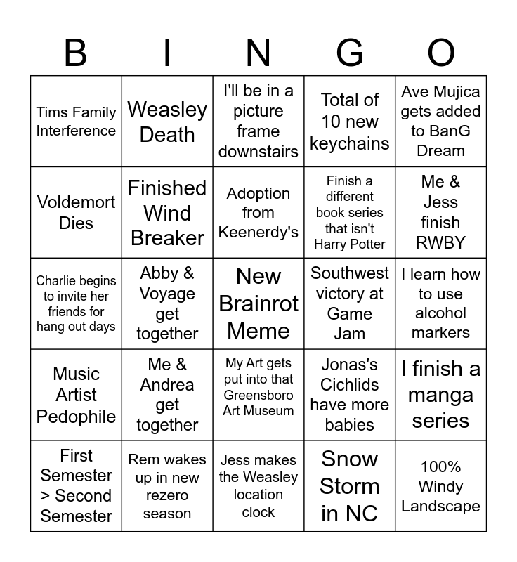 This bingo card has a free space and 24 words: Me & Andrea get together, Rem wakes up in new rezero season, Adoption from Keenerdy's, First Semester > Second Semester, Ave Mujica gets added to BanG Dream, Tims Family Interference, Voldemort Dies, Weasley Death, Southwest victory at Game Jam, My Art gets put into that Greensboro Art Museum, Finish a different book series that isn't Harry Potter, Charlie begins to invite her friends for hang out days, Jonas's Cichlids have more babies, I finish a manga series, Finished Wind Breaker, Snow Storm in NC, I learn how to use alcohol markers, I'll be in a picture frame downstairs, Me & Jess finish RWBY, Abby & Voyage get together, 100% Windy Landscape, Music Artist Pedophile, Total of 10 new keychains and Jess makes the Weasley location clock.