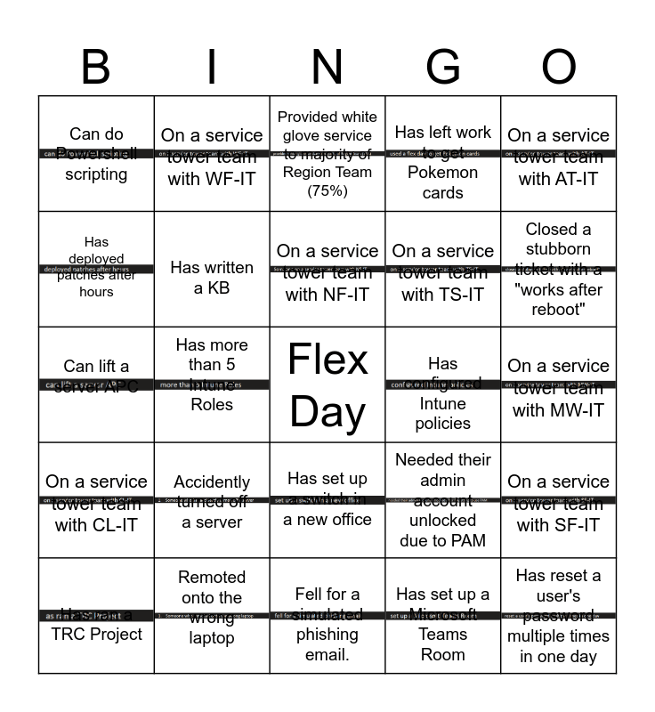 This bingo card has 23 images, a free space and 24 words: Accidently turned off a server, Remoted onto the wrong laptop, On a service tower team with NF-IT, Has ran a TRC Project, On a service tower team with AT-IT, Can do Powershell scripting, Has deployed patches after hours, On a service tower team with WF-IT, Has configured Intune policies, Has set up a switch in a new office, On a service tower team with TS-IT, Can lift a server APC, Needed their admin account unlocked due to PAM, On a service tower team with SF-IT, Has written a KB, Has set up a Microsoft Teams Room, On a service tower team with MW-IT, Provided white glove service to majority of Region Team (75%), Closed a stubborn ticket with a "works after reboot", Has more than 5 Intune Roles, Has reset a user's password multiple times in one day, On a service tower team with CL-IT, Has left work to get Pokemon cards and Fell for a simulated phishing email..