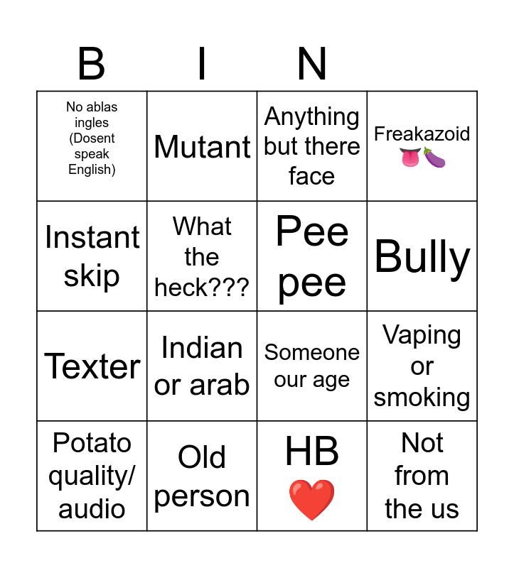This bingo card has 16 words: Old person, Vaping or smoking, Anything but there face, No ablas ingles (Dosent speak English), Texter, Mutant, Someone our age, HB❤️, Instant skip, What the heck???, Potato quality/ audio, Freakazoid 👅🍆, Indian or arab, Bully, Pee pee and Not from the us.