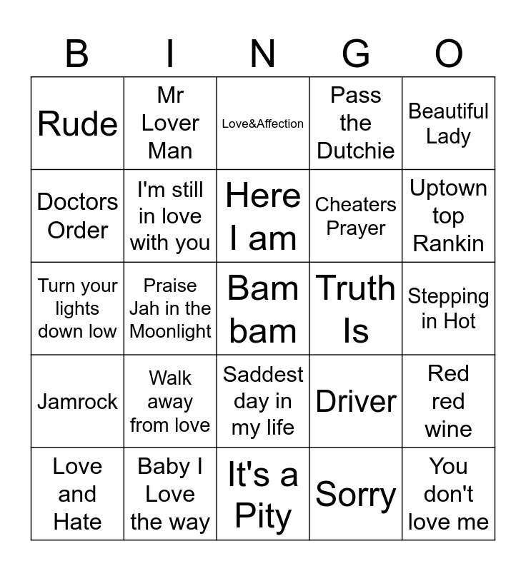 This bingo card has a free space and 30 words: Baby I Love the way, Heartbreak Anniversary, Praise Jah in the Moonlight, Underneath it all, Rude, Love&Affection, I'm still in love with you, Saddest day in my life, Truth Is, It's a Pity, Stepping in Hot, You don't love me, Sorry, Come over, Uptown top Rankin, Make me feel, Driver, Jamrock, Walk away from love, Beautiful Lady, Turn your lights down low, Punkie, Mr Lover Man, Cheaters Prayer, Doctors Order, Pass the Dutchie, Red red wine, Love and Hate, Here I am and Feel Good.