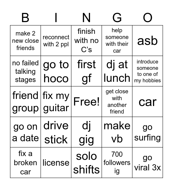 This bingo card has a free space and 24 words: drive stick, license, first gf, fix a broken car, asb, make 2 new close friends, no failed talking stages, reconnect with 2 ppl, get close with another friend, dj gig, dj at lunch, friend group, make vb, go surfing, go to hoco, 700 followers ig, car, finish with no Cās, introduce someone to one of my hobbies, fix my guitar, go viral 3x, go on a date, help someone with their car and solo shifts.