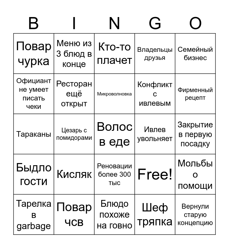 This bingo card has 25 words: Кисляк, Блюдо похоже на говно, Микроволновка, Тарелка в garbage, Семейный бизнес, Повар чурка, Официант не умеет писать чеки, Меню из 3 блюд в конце, Ивлев увольняет, Реновации более 300 тыс, Конфликт с ивлевым, Тараканы, Free!, Мольбы о помощи, Ресторан ещё открыт, Вернули старую концепцию, Закрытие в первую посадку, Кто-то плачет, Фирменный рецепт, Цезарь с помидорами, Волос в еде, Повар чсв, Быдло гости, Владельцы друзья and Шеф тряпка.