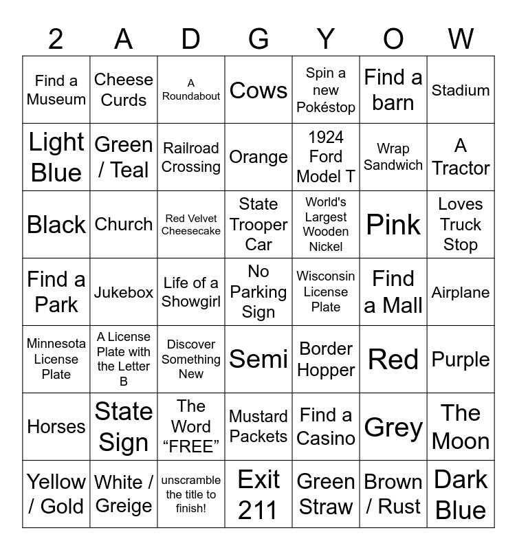 This bingo card has 51 words: Yellow / Gold, Wrap Sandwich, Dark Blue, Jukebox, Red Velvet Cheesecake, Border Hopper, Cheese Curds, Green Straw, Find a barn, Red, Stadium, Cows, Pink, World's Largest Wooden Nickel, Mustard Packets, Minnesota License Plate, Light Blue, A Tractor, White / Greige, Spin a new Pokéstop, 1924 Ford Model T, Life of a Showgirl, Find a Museum, Green / Teal, unscramble the title to finish!, No Parking Sign, Railroad Crossing, Exit 211, Loves Truck Stop, A Roundabout, Someone Walking a Dog, A License Plate with the Letter B, The Word “FREE”, Find a Casino, Semi, Find a Park, Find a Mall, Purple, Horses, State Sign, Black, Church, Grey, Brown / Rust, Wisconsin License Plate, Airplane, Orange, Discover Something New, The Moon, State Trooper Car and I’m Stumped.