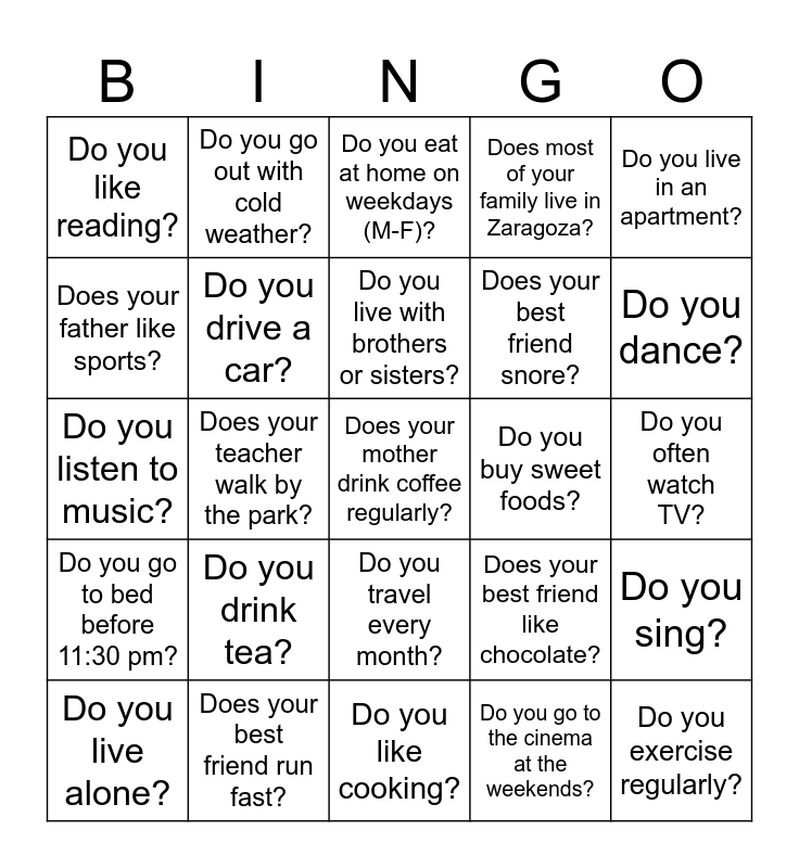This bingo card has 25 words: Do you drink tea?, Do you like cooking?, Do you live with brothers or sisters?, Do you live alone?, Do you live in an apartment?, Do you like reading?, Does your father like sports?, Do you go out with cold weather?, Do you buy sweet foods?, Do you travel every month?, Does your best friend snore?, Do you listen to music?, Does your best friend like chocolate?, Do you sing?, Do you drive a car?, Do you exercise regularly?, Do you often watch TV?, Do you eat at home on weekdays (M-F)?, Do you dance?, Does your teacher walk by the park?, Does your mother drink coffee regularly?, Does your best friend run fast?, Do you go to bed before 11:30 pm?, Does most of your family live in Zaragoza? and Do you go to the cinema at the weekends?.
